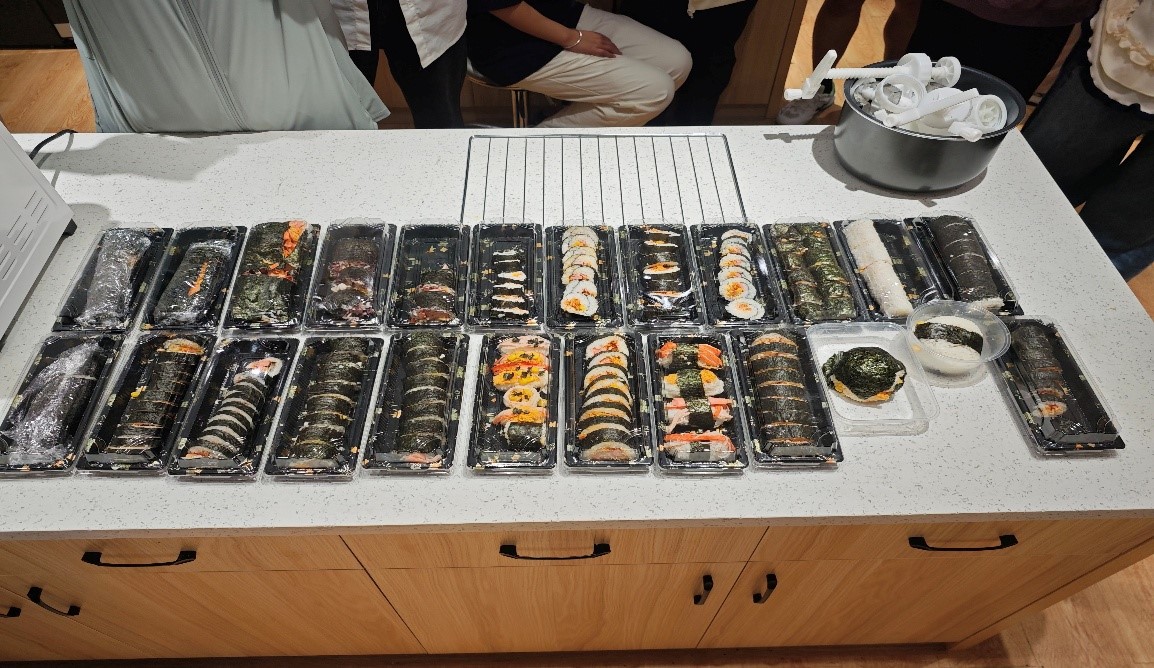 在同学们的共同努力下,形态各异的寿司诞生,同学们开心展示成果,互相品尝,分享寿司制作中的趣事与心得。活动尾声,同学们合影留念,记录美好时刻。