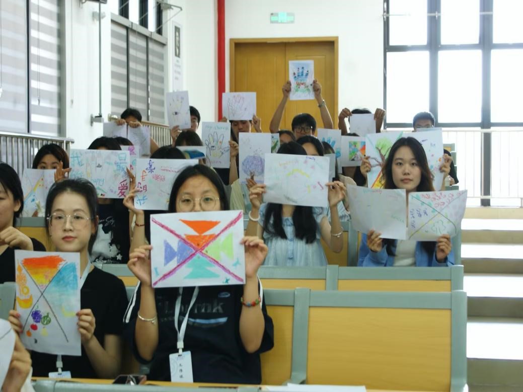 作品完成后,员工们开始互相分享创作故事。食品专业林同学展示了一幅以灯塔为中心的海景画:“海浪代表生活中的挑战,灯塔的光象征家人的支持和自己的内心力量。”海洋专业陈同学则通过破碎又重组的几何图形,讲述自己从迷茫到重拾信心的过程。在分享与倾听中,现场不时爆发出理解的掌声,不少员工表示“没想到一幅画能让同学如此了解自己”。