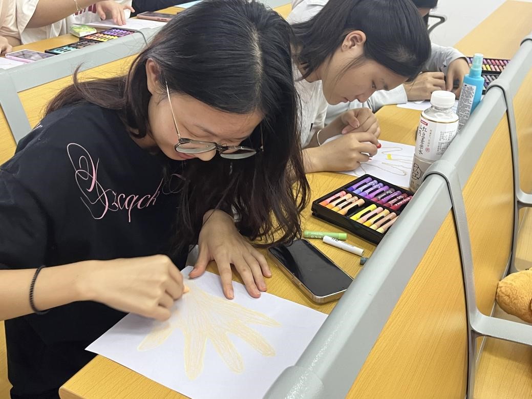 在互动实践环节,李芳带领员工开展主题绘画创作。同学们基于多维添加画的投射原理和多维分析,任选画具自由创作手掌画和叉线画。现场气氛热烈而专注,彩色铅笔在画纸上沙沙作响,颜料在调色盘上晕染出斑斓色彩。有的员工用明快的暖色调描绘充满阳光的田野,表达对未来的积极期待;有的通过交错的线条与深沉的色块,呈现近期的学业压力与情绪困扰;更有员工以抽象的构图展现自我认知的多元维度。李芳老师穿梭其间,轻声与员工交流创作感受,给予个性化指导。